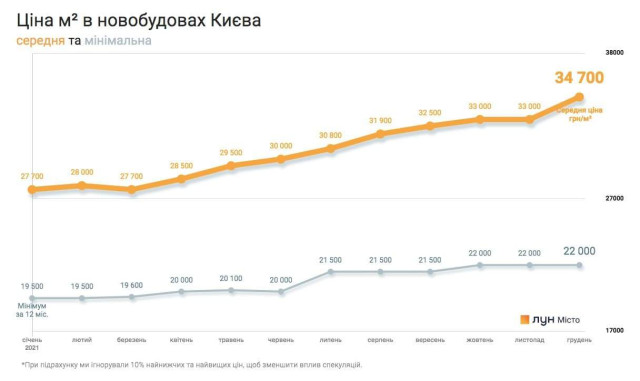 Тим часом за останній місяць ціни на нерухомість за останній місяць суттєво зросли – як в регіонах, так і в столиці. Зокрема, за даними порталу «ЛУН Місто», в столиці за останній місяць вартість нового житла збільшилась на 1,7 тисячі гривень за «квадрат» і тепер становить до 34,7 тисячі.Збільшилась і мінімальна вартість квадратного метру в столиці, яка тепер становить 22 тисячі.