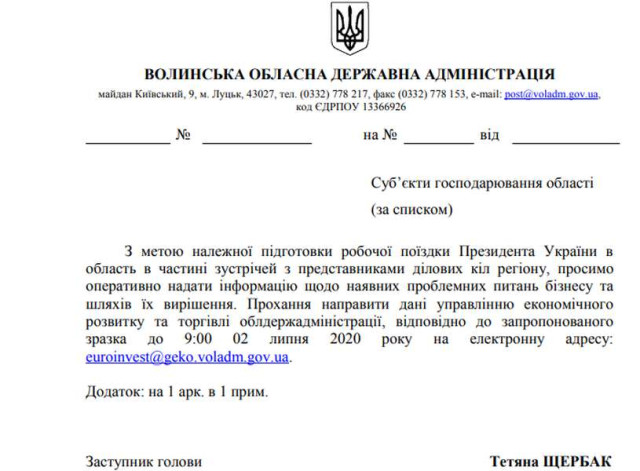 Суб’єктів господарювання просили оперативно надати інформацію щодо наявних проблемних питань бізнесу в регіоні та шляхів їх вирішення. Це було потрібно для того, щоб належно підготувати зустріч гаранта з діловими колами регіону.Програма візиту достеменно невідома, однак, ймовірно, Президент відвідає пункт пропуску «Ягодин» та відкриє школу в одному з районів.