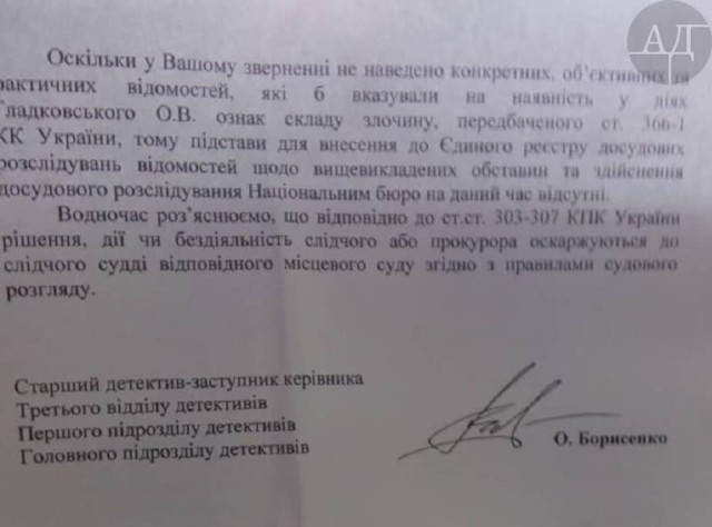 Так, НАБУ відмовило Дубінському у початку досудового розгляду щодо Олега Гладковського: «Оскільки в Вашому звернені не наведено конкретних, об’єктивних та фактичних відомостей, які б вказували на наявність у діях Гладковського О.В. ознак складу злочину…»