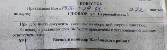 Як розповів один з жителів Жлобина, який раніше служив у ракетних військах, у військкоматі виклик пояснили навчаннями з мобілізації.