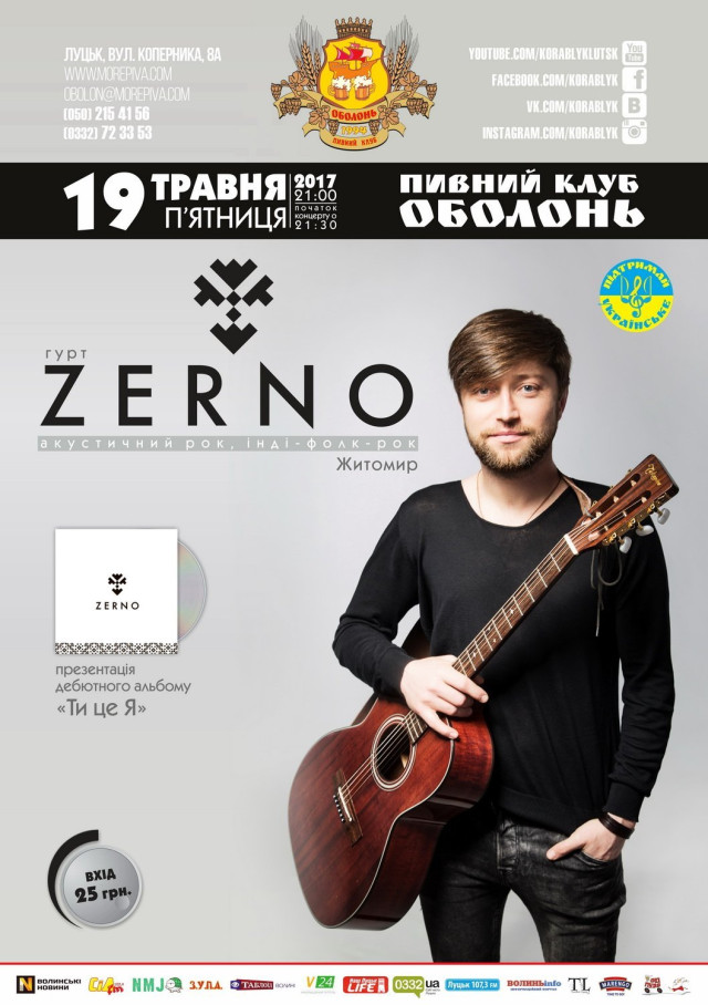До Луцька завітає гурт «ZERNO» (Житомир), який везе до Луцька свій дебютний альбом «Ти це Я». Концерт відбудеться в пивному клубі «Оболонь» у п’ятницю, 19 травня.