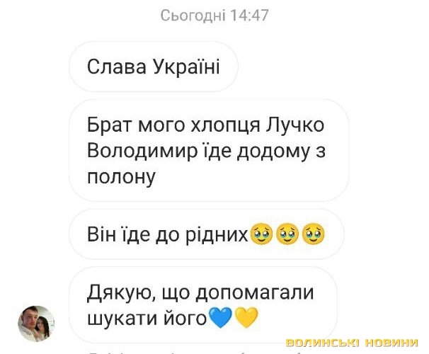 Натомість 23 квітня 2022 року із проханням допомогти у пошуках рідного брата свого хлопця до журналістів звернулась волинянка Любава Наконечна.Нині дівчина не може стримати емоцій і сліз радості: