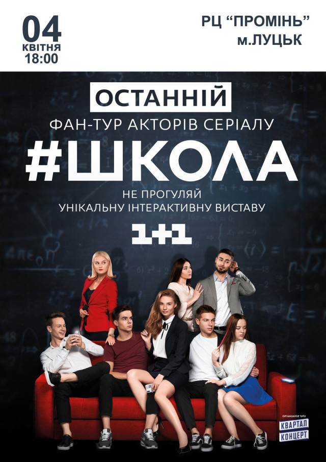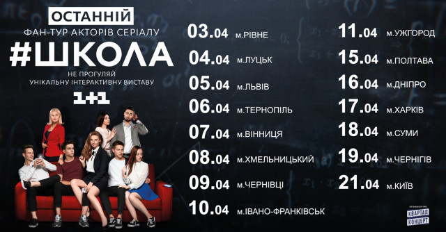 Популярні актори, улюбленці українців, які виконали головні ролі у серіалі «Школа» на «1+1», вирушають у свій останній всеукраїнський тур, у рамках якого відбудеться кілька фан-зустрічей із прихильниками у різних містах України.