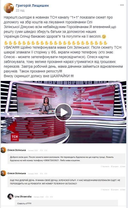 Також зазначається, що після сюжету ТСН, у якому всіх небайдужих просили допомогти 9-річній волинянці, нечисті на руку люди вкрали номер телефону Олесі Зелінської (мама дівчинки, - ред.)
