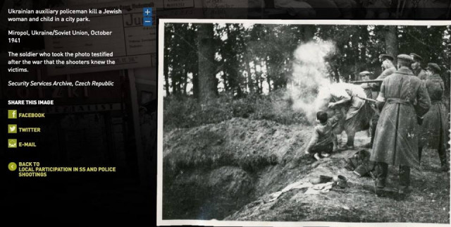 Насправді, пише Едуард Долинський,підпис під цим знімком на сайті Вашингтонського музею Голокосту говорить: «Українська допоміжна поліція вбиває єврейську жінку і дитину в міському парку. Миропіль, Україна / Радянський Союз, жовтень 1941 року. Солдат, який зробив фото, після війни дав свідчення про те, що ті, хто стріляли, були знайомі з жертвами»