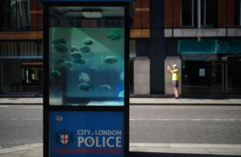Цього разу художник використав напівпрозору фарбу з балончика, щоб перетворити скло поліцейської будки на гігантський акваріум.