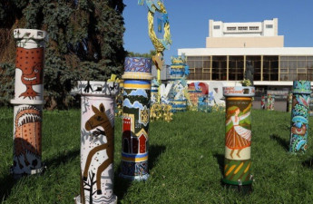 На Театральному майдані Луцька встановили артінсталяцію «НЕЗЛАМНІСТЬ». Це розмальовані 18 тубусів з використаного військового спорядження.