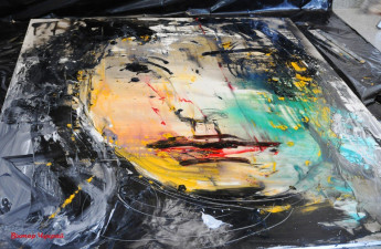 Біле полотно. Пластикове відро з водою. Шпателі. Щітки. Художник Едуард Бєльський виливає трохи води на середину полотна, яке лежить на підлозі, і неймовірно захопливе дійство творення нової картини розпочинається…