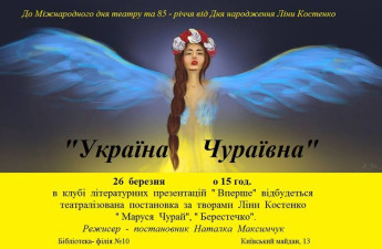 Театралізовану постановку «Україна Чураївна» за творами Ліни Костенко «Маруся Чурай» і «Берестечко» покажуть у Луцьку в четвер, 26-го березня, о 15:00 у бібліотеці-філії № 10 (Київський майдан, 13).