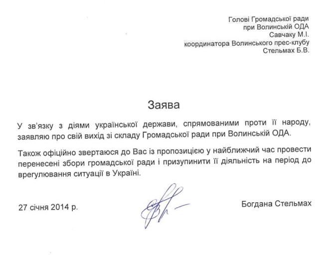 Тиждень тому координатор Волинського прес-клубу Богдана Стельмах написала заяву про вихід із членів Громадської ради при Волинській ОДА і закликала колег підтримати цю ініціативу.