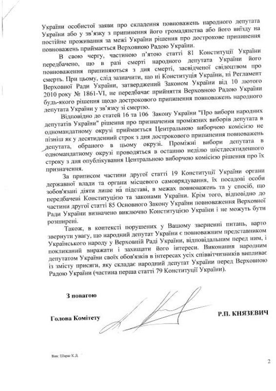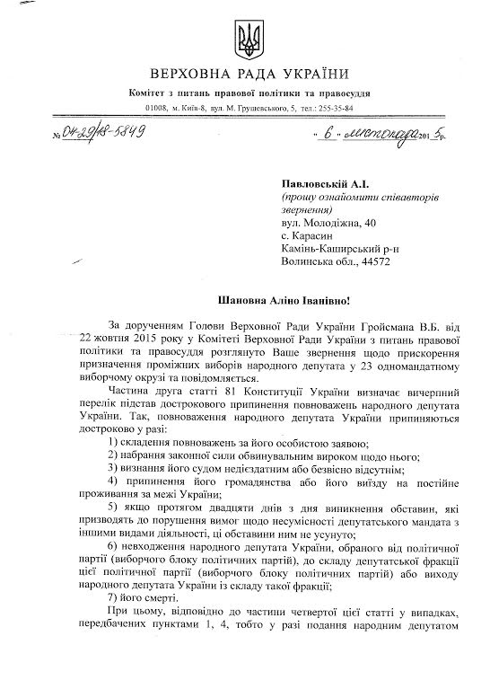 А нещодавно на адресу «Волинської правди» надійшов лист від виборців 23-го округу, в якому вони поділилися сканкопією відповіді з Верховної Ради на їхнє звернення, підписаною головою комітету з питань правової політики та правосуддя, членом депутатської фракції «Блоку Петра Порошенка «Солідарність» Русланом Князевичем.