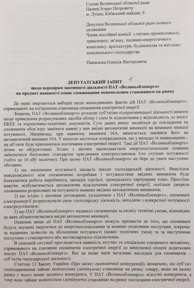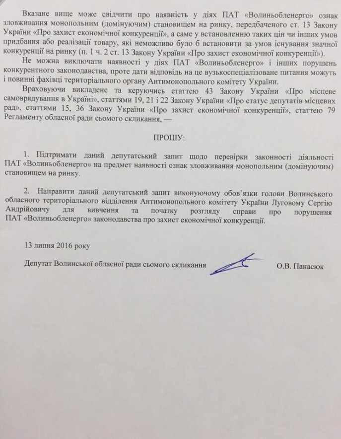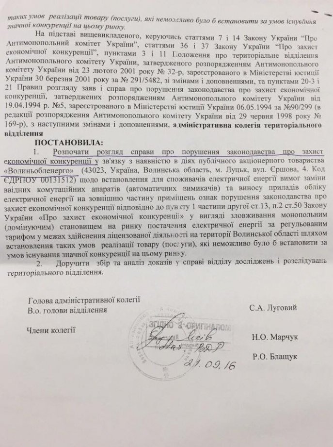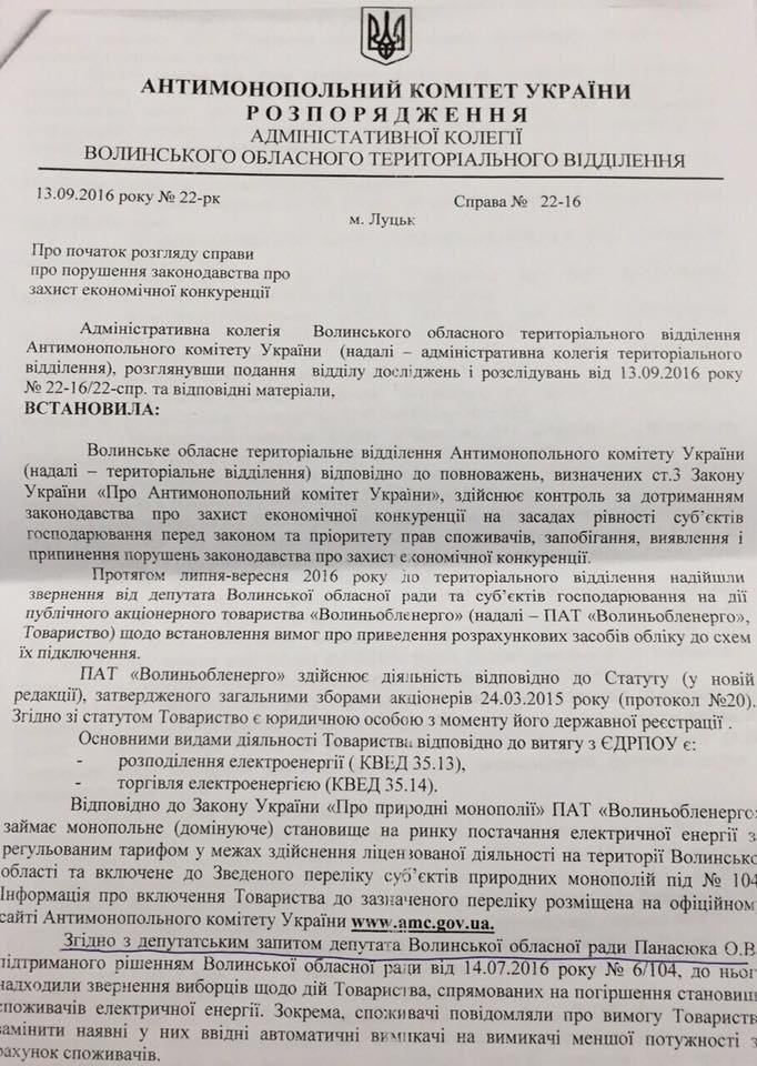 "Антимонопольний комітет України розпочав розгляд справи N22-16 за ознаками зловживання монопольним становищем на ринку ПАТ "Волиньобленерго".