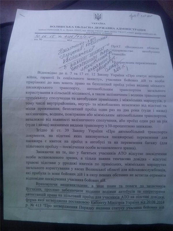 У руки Євгена Яковлєва потрапляє документ, в якому зобов'язали всі волинські АТП видавати квитки з 90% знижкою всім учасникам АТО без «корочки», а тільки при наявності довідки: