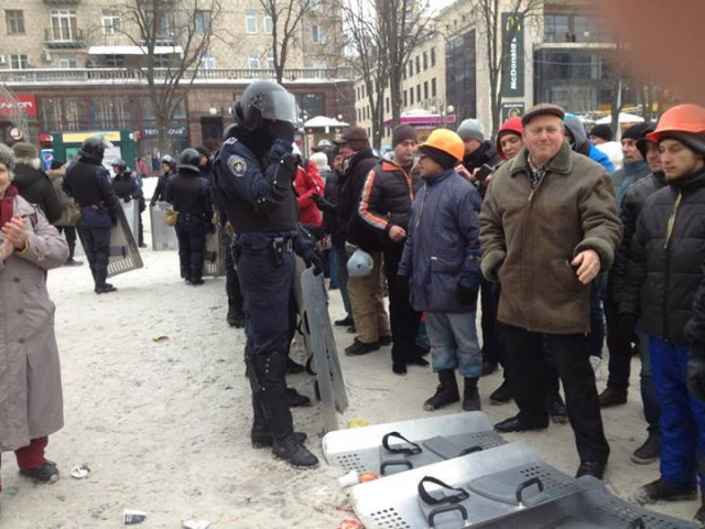 Ось таке фото поширюється в Facebook з написом: «Курсанти внутрішніх військ під крики «Іди додому», кинули щити! Нехай в інших прокинеться совість».Волинець підкреслив, що силовики не просто тіснили мітингувальників, а били і затримували. Нагадаємо, вночі 11 грудня силовики спробували зачистити від мітингувальників Майдан Незалежності.