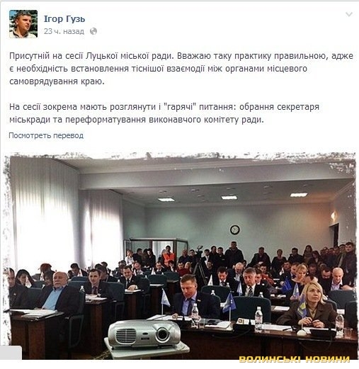 «Присутній на сесії Луцької міської ради. Вважаю таку практику правильною, адже є необхідність встановлення тіснішої взаємодії між органами місцевого самоврядування краю.На сесії зокрема мають розглянути і «гарячі» питання: обрання секретаря міськради та переформатування виконавчого комітету ради», - написав він.
