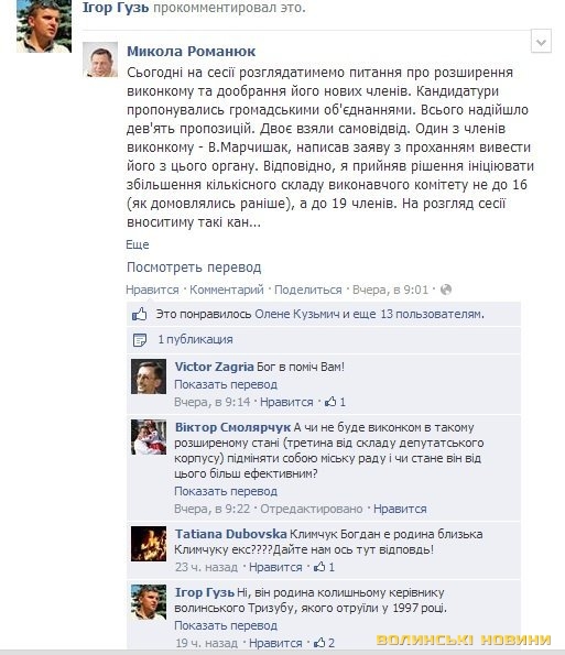 А згодом Ігор Гузь у коментарях з приводу цієї новини пояснював, що один з нових членів міськвиконкому, представник Волинської самооборони Богдан Климчук – не родич екс-голови ОДА Бориса Клімчука.