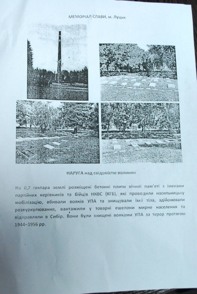 Про це стало відомо під час засідання постійної комісії міської ради з питань дотримання прав людини, законності, боротьби зі злочинністю, депутатської діяльності, етики та регламенту сьогодні, 22 жовтня. Ініціаторами колективної пропозиції щодо демонтажу окремих елементів меморіалу виступили члени Братства ОУН-УПА, організації політв’язнів та репресованих, Ліги українських письменників, ГО «Пам'ять Волині», Асоціація Козацьких Стрілецьких Братств України. Розміщення радянської символіки на меморіальному комплексі вони називають не інакше, як «наругою над свідомістю волинян».«На території у 0,7 гектарів землі розміщені бетонні плити вічної пам’яті з іменами партійних керівників та бійців НКВС (КГБ), які проводили насильницьку мобілізацію, вбивали вояків УПА та знищували їхні тіла, здійснювали розкуркулення, вантажили у товарні ешелони мирне населення та відправляли в Сибір. Вони були знищені воякам УПА за терор протягом 1944-1956 років», - йдеться у зверненні. На думку представника від вищезгаданих організацій, який виступив доповідачем з пікантного питання, не може бути у сьогоденні меморіалу слави, який увіковічнює усе спричинене тоталітарним режимом горе.