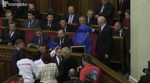 У листопаді 2013-го після відмови Януковича підписати угоду про асоціацію з ЄС, прем'єр-міністр Микола Азаров, використовуючи все своє красномовство, намагався переконати депутатів у правильності рішень влади, викинувши перед цим з урядової ложі підкладений опозицією прапор ЄС. Євромайдан, що ціною людських життів змете і Азарова, і Януковича, тоді тільки починався.