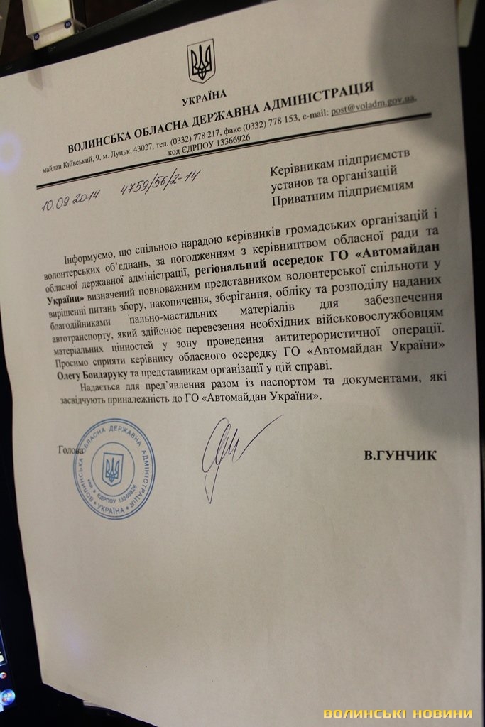 Свого часу голова облдержадміністрації підписав «розписку», що розпорядником всього пального, яке виділятиметься волонтерським організаціям, буде регіональний осередок ГО «Автомайдан України». Представники цієї організації кажуть: влада таки виділила пальне, але всього 2 тонни від «Укрпетроль». На цьому дизпаливі вони їздили більше 3 місяців. Усі акти прийому-передачі, всі підтверджуючі документи у волонтерів є.