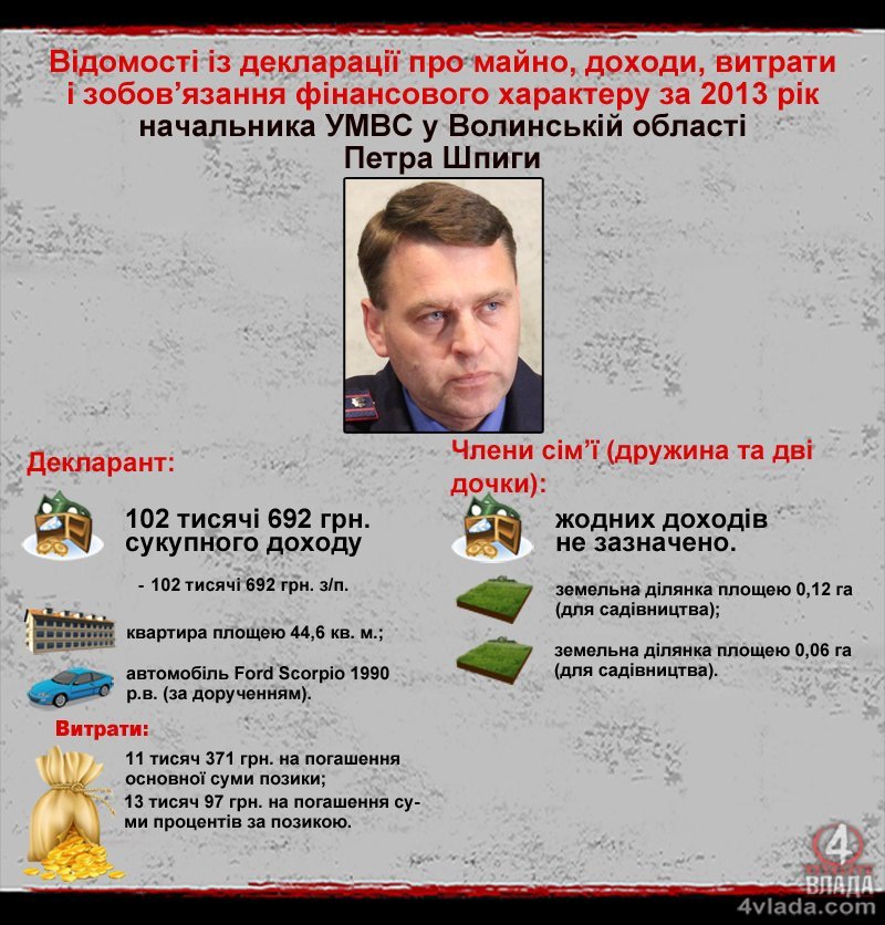 Згідно із майновою декларацією нинішнього начальника волинської міліції Петра Шпиги, на момент звітування у лютому 2014 року і весь 2013 рік він працював начальником відділу боротьби зі злочинами, пов’язаними з торгівлею людьми управління МВС України у Волинській області. На цій посаді протягом року він заробив понад 102 тисячі гривень. Усе – зарплата.