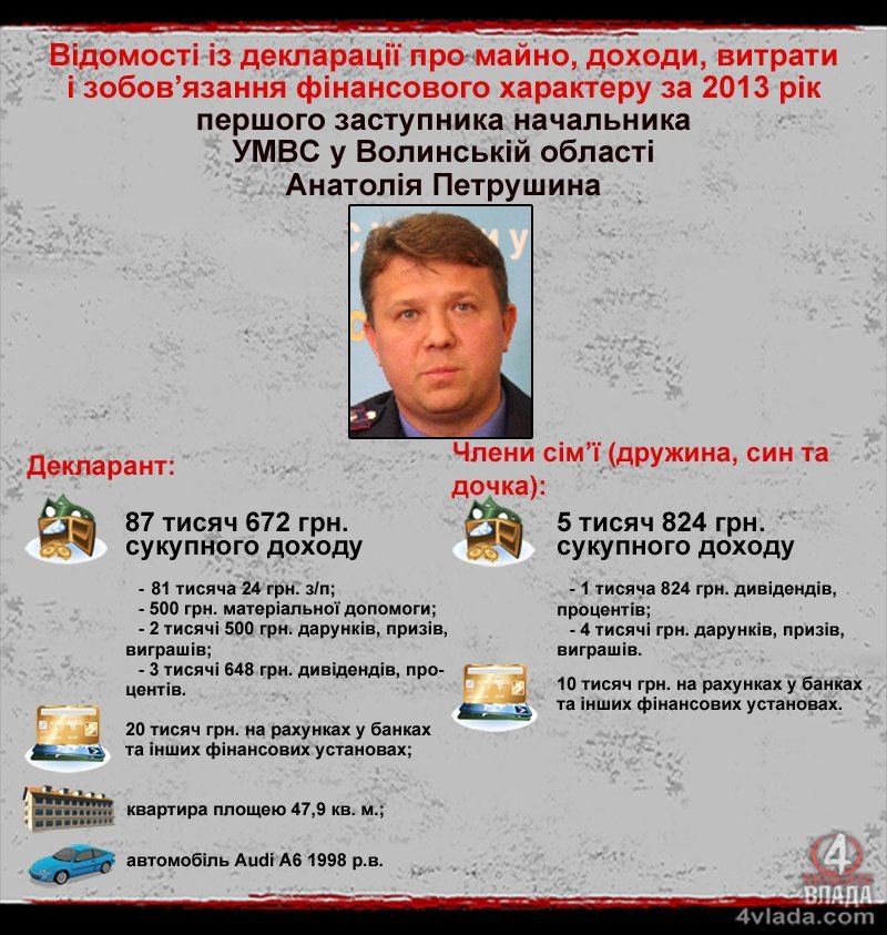 На рахунках у банках сім’я міліціонера на той час зберігала 30 тисяч гривень. Серед майна Анатолія Петрушина вказані квартира загальною площею 47,9 кв. м. і старенький автомобіль «Audi A6» 1998 року випуску.