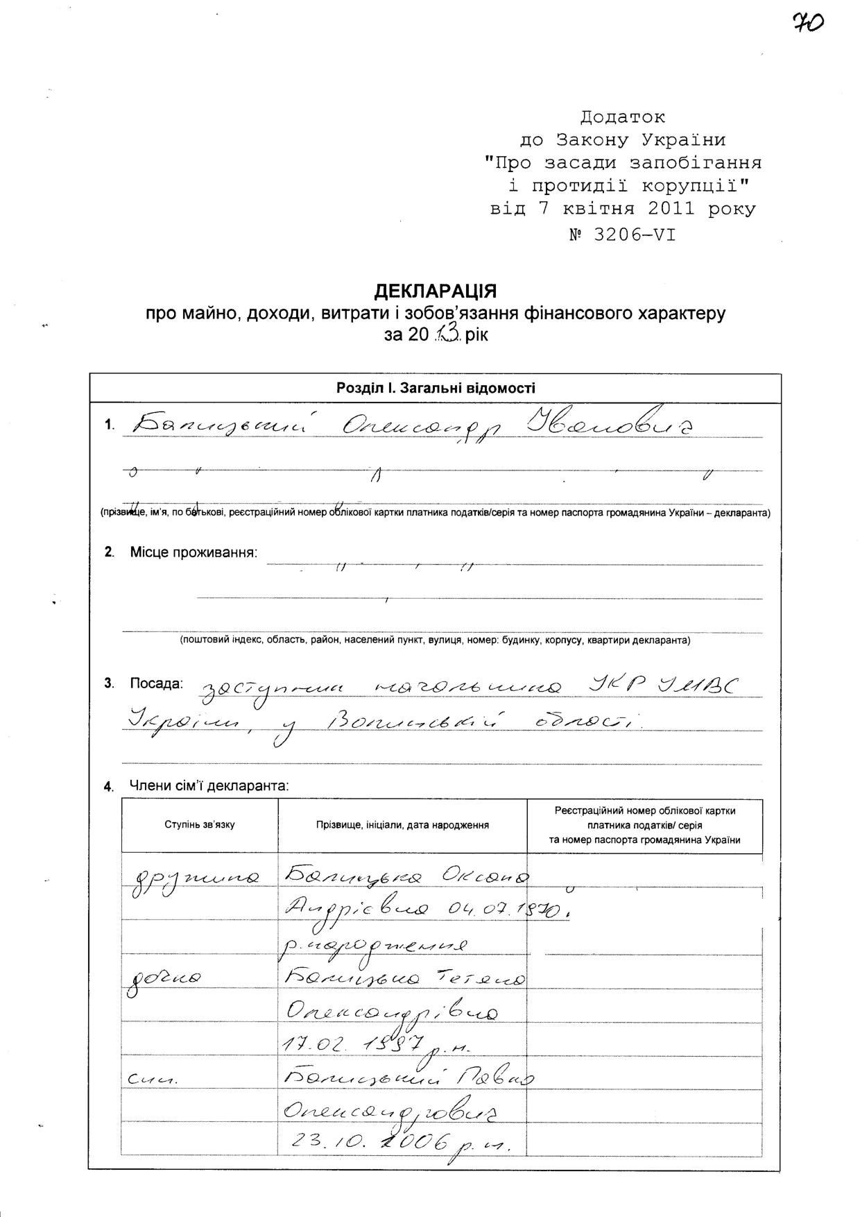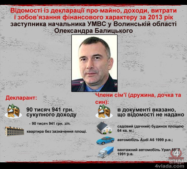 Майже 91 тисячу гривень у 2013 році заробив нинішній заступник начальника УМВС у Волинській області Олександр Балицький. Щоправда, на той момент він працював заступником начальника управління карного розшуку УМВС у Волинській області. Усі задекларовані доходи Олександра Балицького – зарплата.
