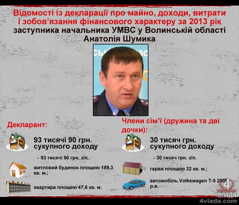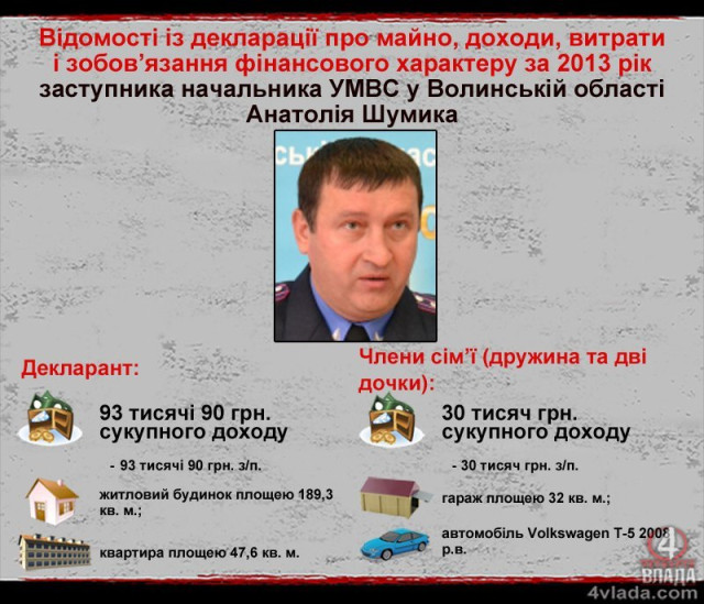 Ще один заступник Петра Шпиги Анатолій Шумик у 2013 році працював начальником управління громадської безпеки УМВС у Волинській області. Позаторік він отримав понад 93 тисячі гривень доходу. Усе – зарплата. Ще 30 тисяч гривень зарплати задекларовано у членів сім’ї міліціонера, серед яких дружина та дві дочки.