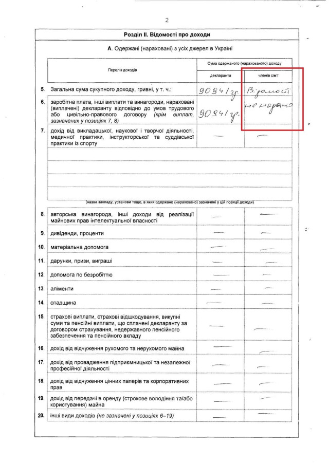 Разом з тим, у його дружини та двох дочок жодних доходів не задекларовано.