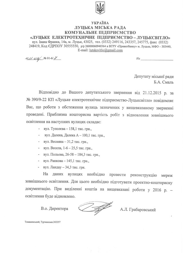 Після публікації статті ЛУЦЬКА МІСЬКРАДА ВІДПОВІДАЄ НА ЗВЕРНЕННЯ «АВТОМАТИЧНОЮ РОЗСИЛКОЮ»? депутат сьогодні отримав ще одну відповідь на теж саме звернення, цього разу – від профільного підприємства.
