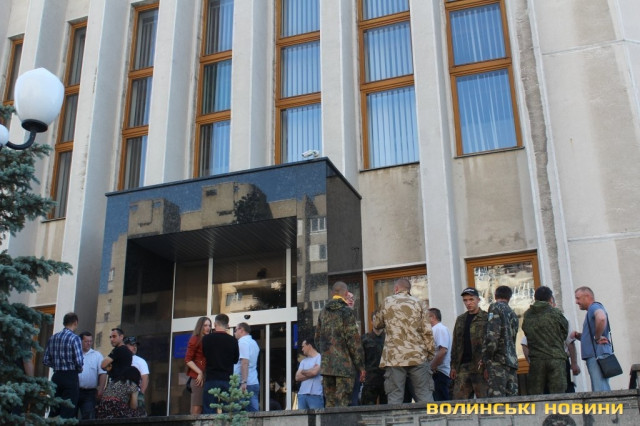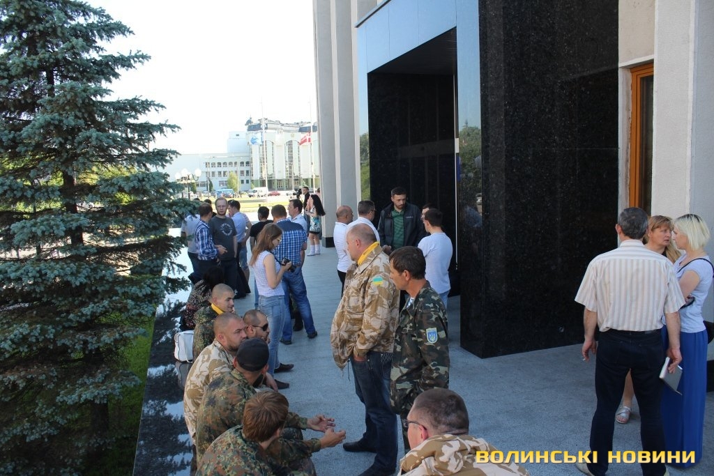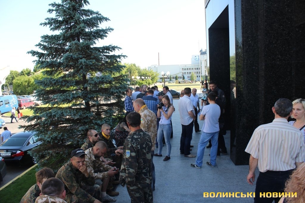 Перед початком третього пленарного засідання 25-ї сесії Волиньради 23 травня десятки активістів зібралися поблизу входу до будівлі обласної ради.