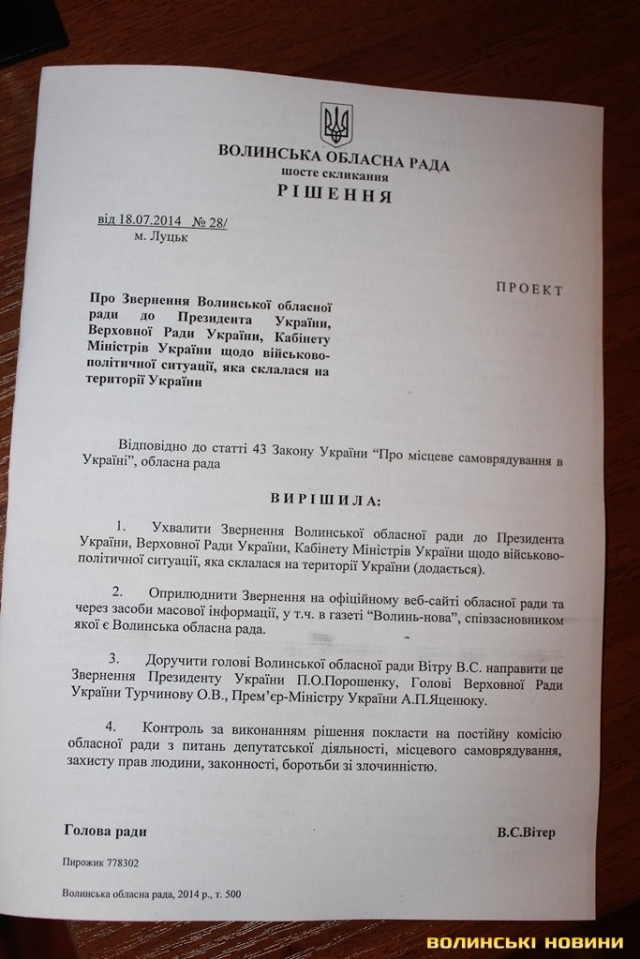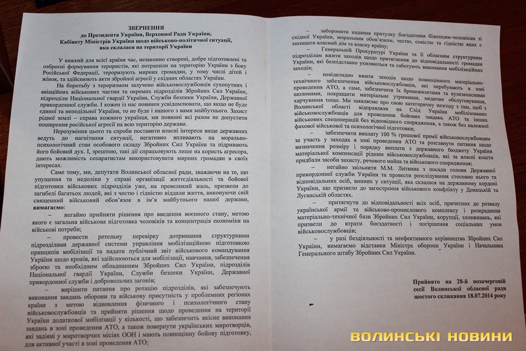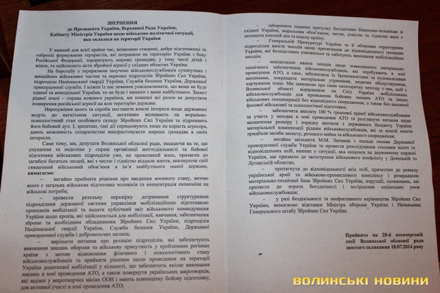 Так, відповідно до статті 43 Закону України «Про місцеве самоврядування в Україні», обласна рада вирішила ухвалити Звернення облради до Президента України, Верховної ради України, Кабінету Міністрів України щодо військово-політичної ситуації, яка склалася на території України. Також постановили це Звернення оприлюднити в ЗМІ й доручили голові облраді Валентину Вітру направити це звернення у Київ.У Зверненні йдеться, що зараз важкий стан в країні й зваживши на ту ситуацію, яка склалася, вимагають: негайно прийняти рішення про введення воєнного стану, аби провести загальну військову підготовку чоловіків; забезпечити зброєю та необхідним обладнанням Збройні сили України й інші воєнізовані, правоохоронні підрозділи; вирішити питання про ротацію підрозділів, а також повернути українських миротворців, які задіяні у миротворчих місіях ООН; заборонити надавати притулок переселенцям-чоловікам зі Сходу України, обов’язком яких є захищати власний дім; Генеральній Прокуратурі Україні вжити заходів щодо притягнення до відповідальності громадян України, які ухиляються та саботують мобілізаційні заходи; забезпечити виплату 100% грошової премії військовослужбовцям за участь у заходах в зоні АТО та виплатити компенсацію за придбані власним коштом військове спорядження; негайно звільнити Литвина з посади голови Державної прикордонної служби України; притягнути до відповідальності осіб, які причетні до розвалу української армії; у разі бездіяльності та неефективності керівника Збройних сил України, вимагаємо відставки Міністра оборони України і начальника Генерального штабу Збройних сил України.За це рішення проголосували одноголосно – 44 депутати.