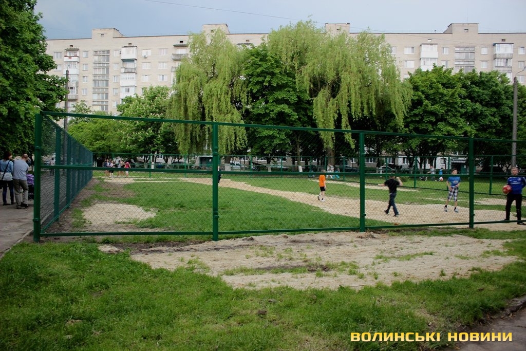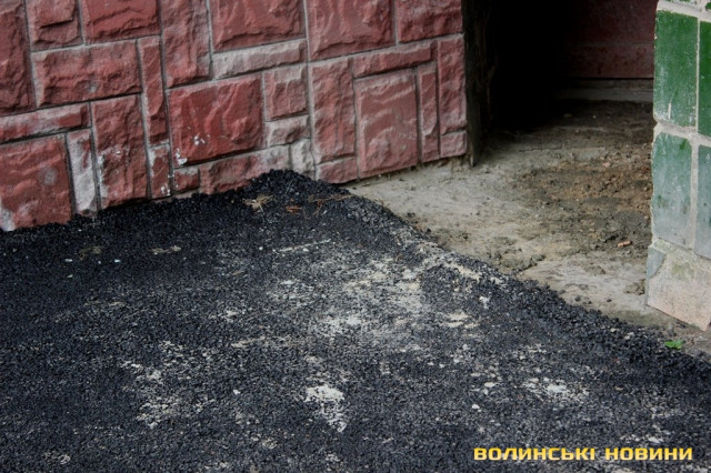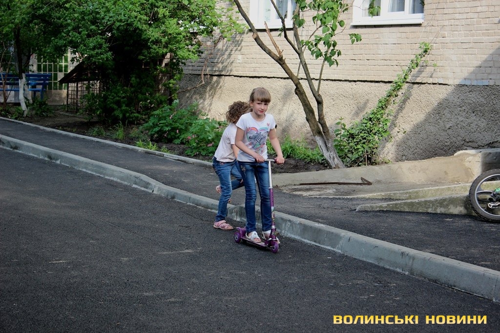 Так, заасфальтували 491 квадратний метр тротуарного покриття і 1421 квадратний метр проїзної частини.Крім того, за 30 тисяч гривень на прибудинковій території встановили дитяче ігрове обладнання: пісочниці, гойдалки, лавки, а за будинком футбольний майданчик обтягнули сіткою. От тільки до прийому робіт не встигли встановити ще й ворота.