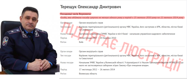 Нагадаємо, Олександр Терещук 25 лютого 2014 року під тиском громади написав рапорт про відставку. А 3 липня Президент України Петро Порошенко скасував люстрацію Олександра Терещука.