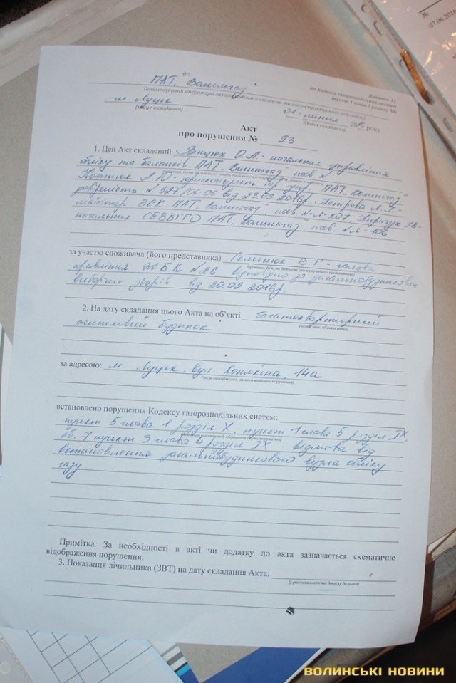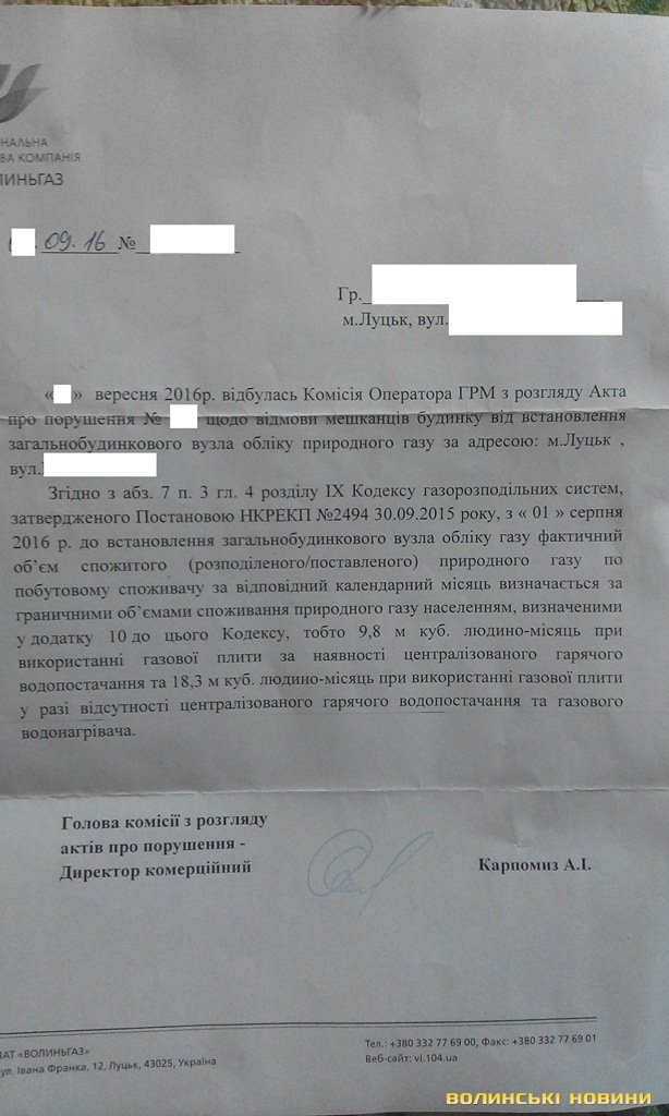 «Згідно з абз. 7 п. З гл. 4 розділу IX Кодексу газорозподільних систем, затвердженого Постановою НКРЕКП №2494 30.09.2015 року, з (дата) до встановлення загальнобудинкового вузла обліку газу фактичний об'єм спожитого (розподіленого/поставленого) природного газу по побутовому споживачу за відповідний календарний місяць визначається за граничними об’ємами споживання природного газу населенням, визначеними у додатку 10 до цього Кодексу, тобто 9,8 метра кубічних людино-місяць при використанні газової плити за наявності централізованого гарячого водопостачання та 18,3 метра кубічних людино-місяць при використанні газової плити у разі відсутності централізованого гарячого водопостачання та газового водонагрівача».Тобто, ті, хто не захотів ставити загальнобудинковий лічильник, в трактуванні ПАТ «Волиньгаз», вже підписали собі вирок: їм нараховуватимуть плату «по повній». І нікого не хвилює, що споживачі не проти лічильника взагалі, а просто хочуть квартирний прилад обліку.Власне, згаданий абзац Кодексу газорозподільних систем звучить наступним чином: «Якщо побутовий споживач, який не забезпечений лічильником газу, відмовляється від його встановлення за рахунок Оператора ГРМ (що підтверджується актом про порушення, складеним відповідно до вимог глави 5 розділу ХІ цього Кодексу), фактичний об’єм спожитого (розподіленого/поставленого) природного газу по побутовому споживачу за відповідний календарний місяць визначається за граничними об’ємами споживання природного газу населенням, визначеними у додатку 10 до цього Кодексу».