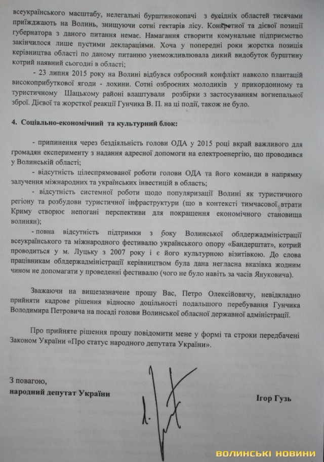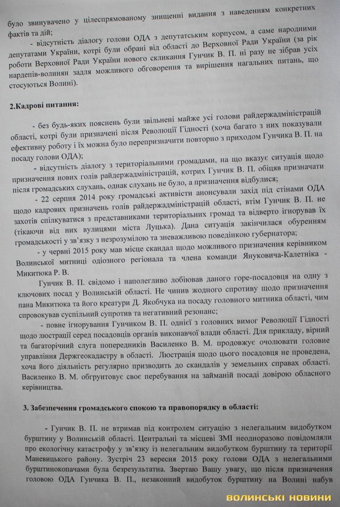 Окрім цього, Володимиру Гунчику депутат закидає те. що очільник ОДА не втримав під контролем ситуацію з нелегальним видобутком бурштину, не забезпечив дієвої та жорсткої реакції на озброєний конфлікт щодо плантацій лохини у Шацькому районі.