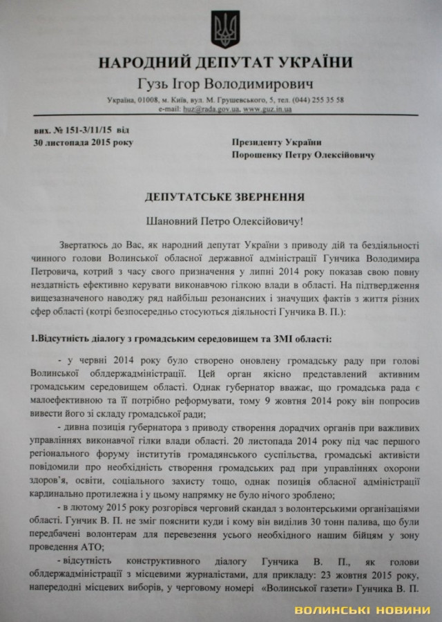 Ігор Гузь повідомив, що підготував депутатське звернення до президента, у якому наводить аргументи на користь того, що Володимир Гунчик з часу свого призначення у липні 2014 року продемонстрував нездатність ефективно керувати виконавчою гілкою влади у області. У зверненні йдеться про те, що голова ОДА не зміг налаштувати діалог громадським середовищем та ЗМІ області (наприклад, конфлікт з волонтерським середовищем, відсутність конструктивного діалогу з журналістами, зокрема, цілеспрямоване знищення «Волинської газети»).