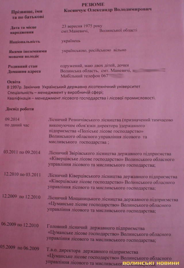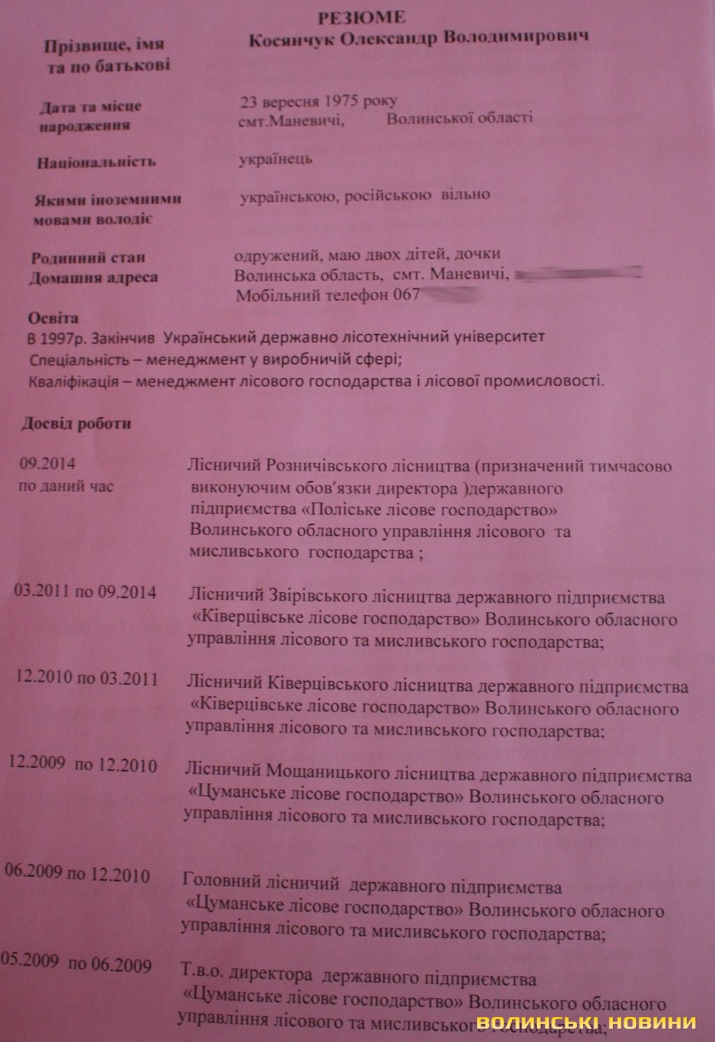 Єдиний претендент на посаду Олександр Косянчук розповів, що народився у селищі Маневичі в сім’ї батька-військовослужбовця та матері медичного працівника. Розпочав свою трудову діяльність на посаді заготовувача шпилькової лапки у Маневицькому лісництві, після чого здобував вищу освіту в Українському державному лісотехнічному університеті міста Львова. Працював майже на всіх посадах у лісогосподарствах: від єгеря до директора Цуманського лісгоспу, нині обіймає посаду виконуючого обов’язків директора ДП «Поліське лісове господарство», яке хоче очолити.Як аргумент він наводить фінансові результати діяльності підприємства. Зокрема, якщо порівнювати перше півріччя лісгоспу 2015 року з аналогічним періодом у 2014 році, обсяг реалізації продукції збільшився у 2,5 рази, чисельність працівників – з 45 до 71 людини, а чистий прибуток – більш як удвічі. Середня заробітна плата по лісгоспу складає 5600 гривень, у той час як минулого року становила 3400. Зі слів Касянчука, нещодавно виділили кошти на профспілку для того, аби 12 дітей мали змогу відпочити у дитячих таборах, чого не було раніше.У Олександр Косянчука цікавились, яка нині радіологічна ситуація у його господарстві. Мовляв, частина лісів Маневицького району відносяться до так званої «третьої зони». А тому заражені ягоди та гриби а також вбиті тварини можуть становити небезпеку для споживачів. У відповідь чоловік зауважив, що лісгосп не заготовляє ягодів та грибів, проте видають документи на збір з прив’язкою до конкретної локації. Біля зон з особливо високим рівнем забруднення встановлюють спеціальні знаки, проте на території ДП «Поліське лісове господарство» таких зон немає. А що стосується деревини, то на неї видають сертифікати, які неможливо отримати без висновків радіологічної експертизи.