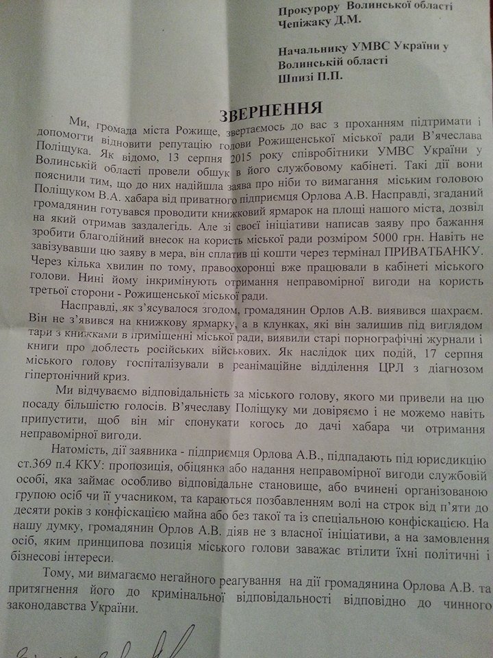 Також активісти вимагають перевірити дії самого Артема Орлова . Як повідомляють рожищани, під час своїх попередніх візитів до В’ячеслава Поліщука, цей чоловік постійно спонукав мера до взяття хабара, а отримавши різку відсіч, самовільно перевів гроші,як благодійну допомогу, на рахунок міської ради. Потому написав заяву до правоохоронних органів про те, що рожищенський міський голова вимагав у нього хабар.