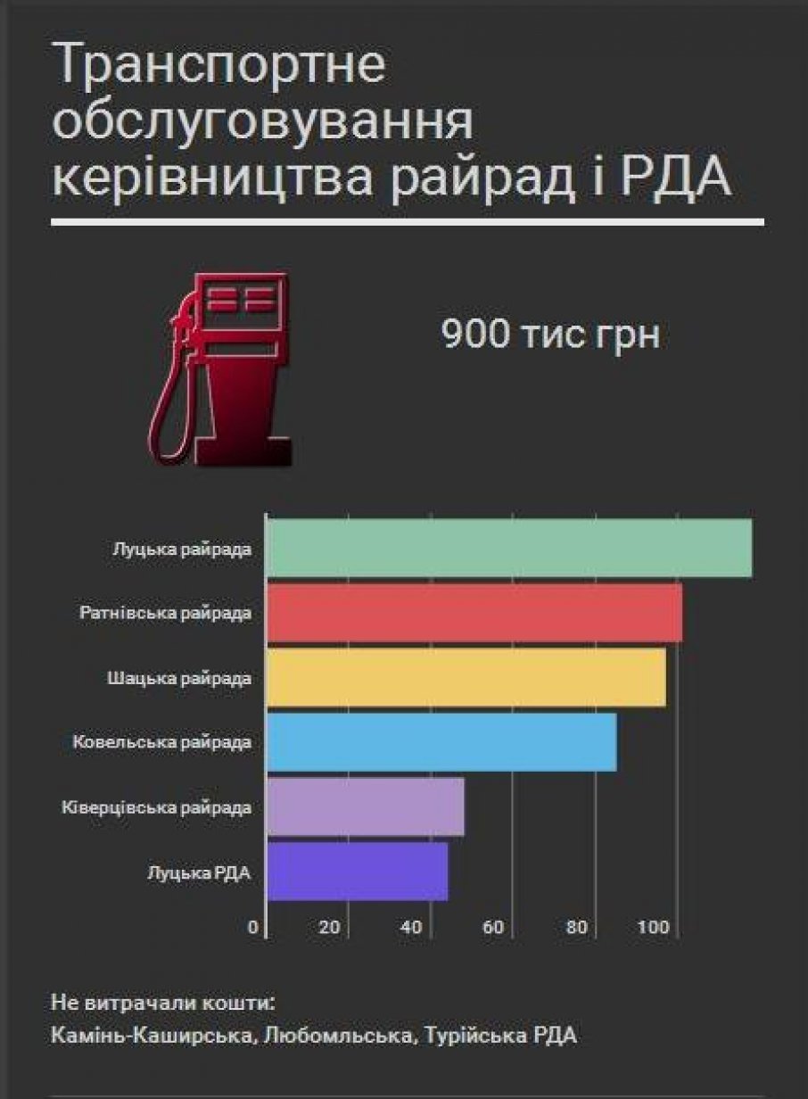 Найдорожчим виявився проїзд голови та заступників Луцької (понад 118,2 тисячі гривень), Ратнівської (майже 101,6 тисячі гривень) та Шацької (понад 96,5 тисячі гривень). Для прикладу, у Шацькій РДА аналогічні видатки становили понад 17 тисяч гривень.