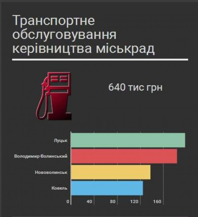 Зокрема, у Луцьку на транспортне обслуговування мера, його заступників та секретаря міськради у 2015 році із бюджету витратили 196,8 тисячі гривень. У Володимирі-Волинському – майже 183,4 тисячі гривень, Нововолинську – понад 137,4 тисячі гривень, Ковелі – 124 тисячі гривень. Загалом це становить не мало і не багато – понад 640 тисяч гривень.