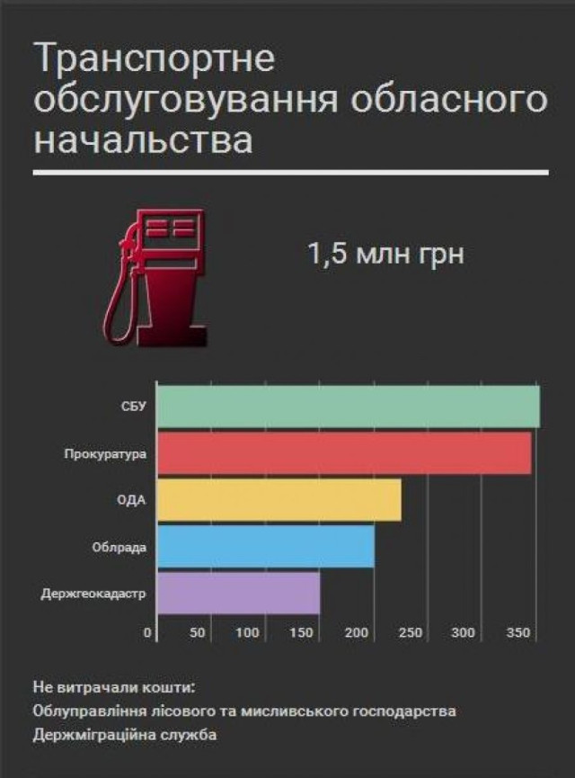 Є відомства, які не витратили ані копійки на транспортне обслуговування начальства. Серед них – Волинське облуправління лісового та мисливського господарства та місцевий підрозділ Держміграційної служби.