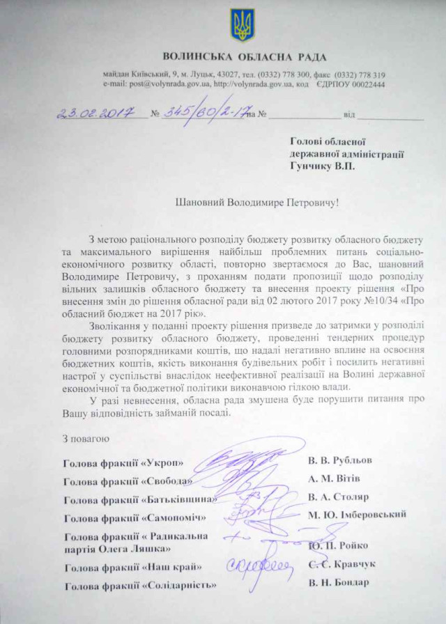 23 лютого голови 6 фракцій обласної ради звернулися до голови ОДА з проханням надати пропозиції внесення змін до обласного бюджету 2017 року, щоб не зволікати з розподілом перехідних залишків, а відповідно, бюджету розвитку та проведення тендерних процедур, нагадують на сайті облради.