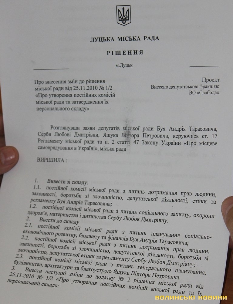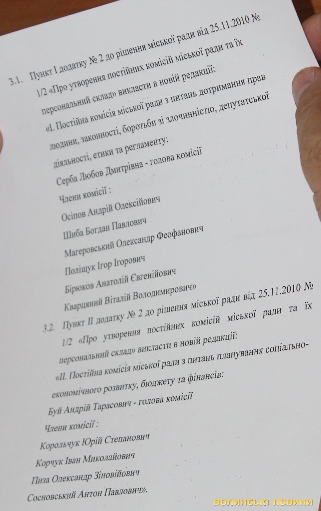 «Такі зміни – це бачення нашої фракції», - пояснив Вега й більше нічого не уточнював.Так, згідно з пропонованим документом, головою постійної комісії міської ради з питань дотримання прав людини, законності, боротьби зі злочинністю, депутатської діяльності, етики та регламенту хочуть призначити Любов Сербу. На чолі постійної комісії міської ради з питань генерального планування, будівництва, архітектури та благоустрою бачать нового депутат Луцькради Віктора Ящука. Так, депутата Андрія Буя хочуть посадити в крісло голови постійної комісії міської ради з питань планування соціально-економічного розвитку, бюджету та фінансів.Серед депутатів розгорілася дискусії щодо персони Любов Серби, яка зараз є членом постійної комісії міської ради з питань соціального захисту, охорони здоров’я, материнства та дитинства.
