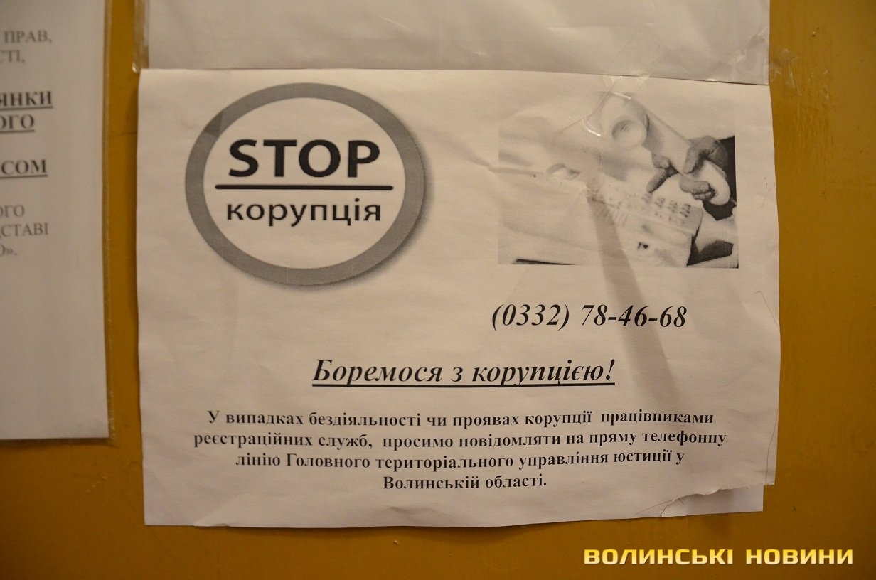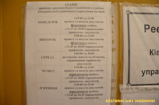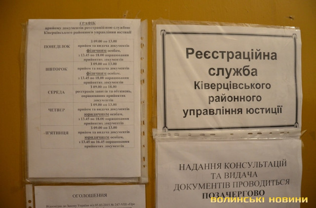 Так, днями до Інформаційного агентства Волинські Новини звернулась жителька Луцька з проханням посприяти у вирішенні проблемної ситуації в районному відділі Державної реєстраційної служби України в Ківерцях. З її слів, уже кілька місяців поспіль люди тижнями чекають прийому через вкрай повільне просування черги. Дехто, хто доїжджає з району, навіть займає чергу звечора і ночує на сходах установи, аби зранку бути в черзі першим. На місці працює одна людина, яка проводить прийом документів фізичних осіб двічі на тиждень з дев'ятої до тринадцятої години. При цьому на прийом однієї людини з незрозумілих причин йде близько півгодини.