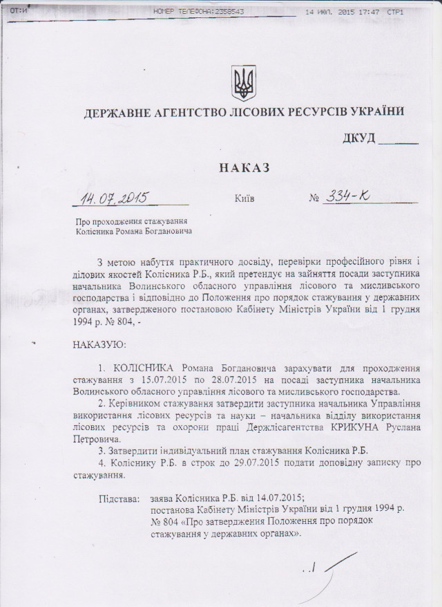 14 липня 2015 року з Державного агентства лісових ресурсів України на адресуВолинського обласного управління лісового та мисливського господарства надійшов наказ про проходження стажування сином колишнього голови управління Богдана Колісника – Романом Колісником.