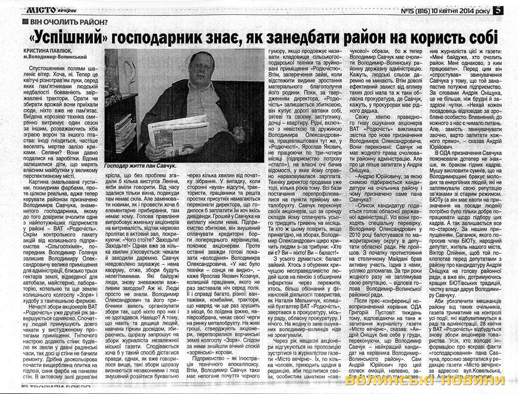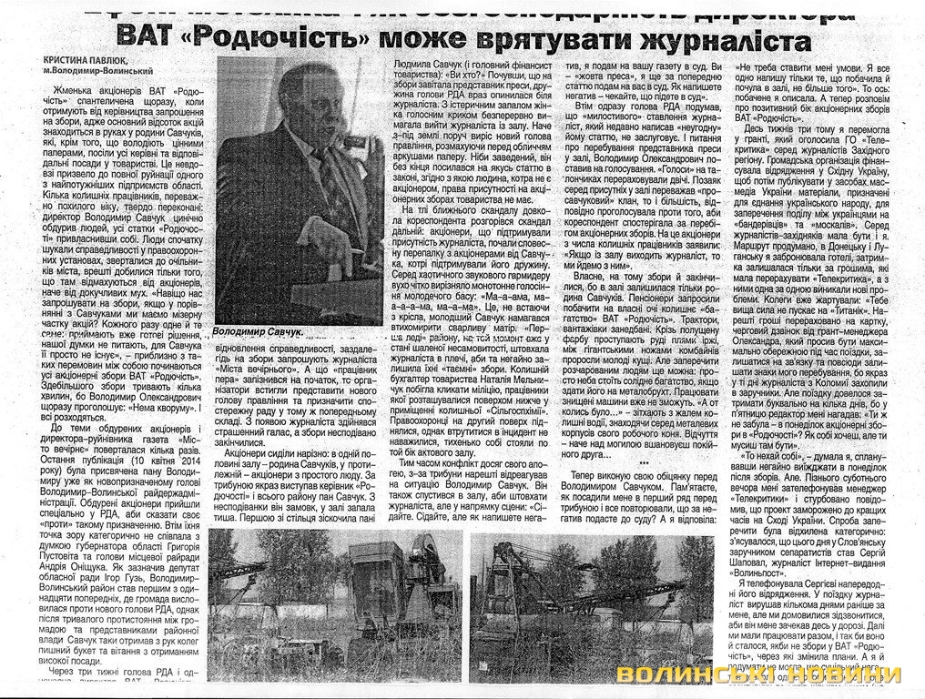 Сума позову – 6 тисяч гривень моральної шкоди. До слова, газета «Місто вечірнє», каже Едуард Залуський, офіційно визнане владою як опозиційне видання.Зі слів редактора газети, свого часу Володимир Савчук, перебуваючи на посаді голови правління ВАТ «Родючість», опинився в центрі скандалу. Колишні працівники, дійсні акціонери підприємства, у квітні 2013 року попросили про проведення журналістського розслідування. Оскільки вони стверджували, що на ВАТ «Родючість» не виплачують дивідендів, згортають господарську діяльність, продають матеріальні цінності тощо. Річ у тім, що ВАТ «Родючість» «виросло» з колись потужного підприємства ВАТ «Сільгоспхімія», та згодом розгубило свої потужності, каже Едуард Залуський.
