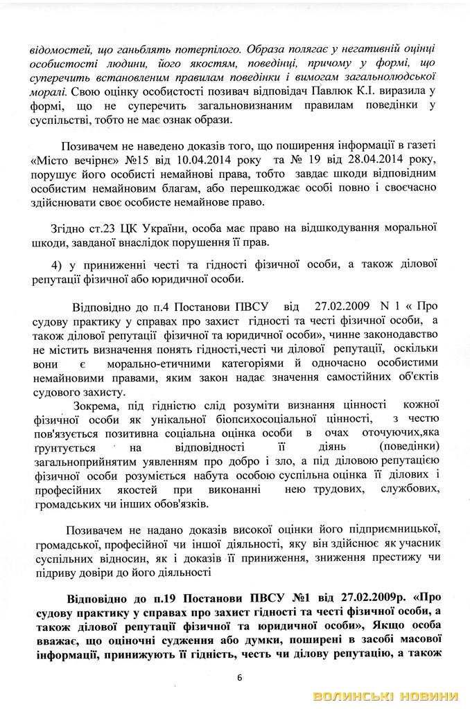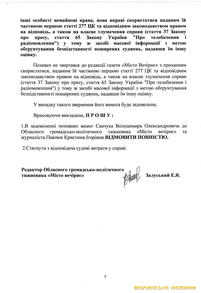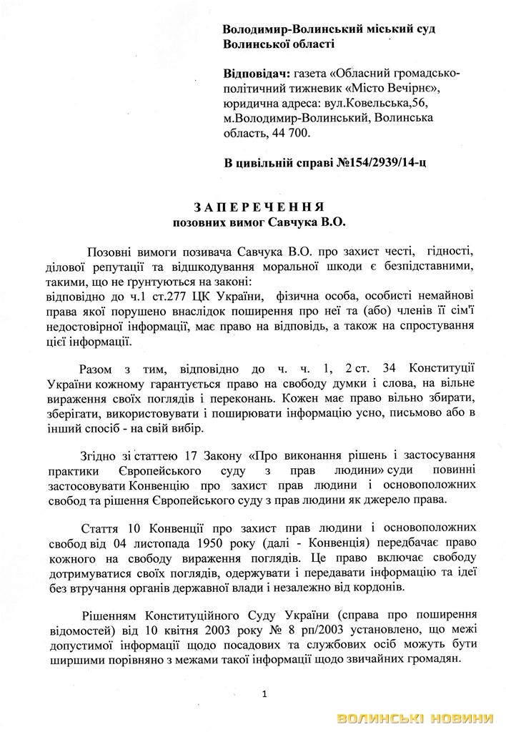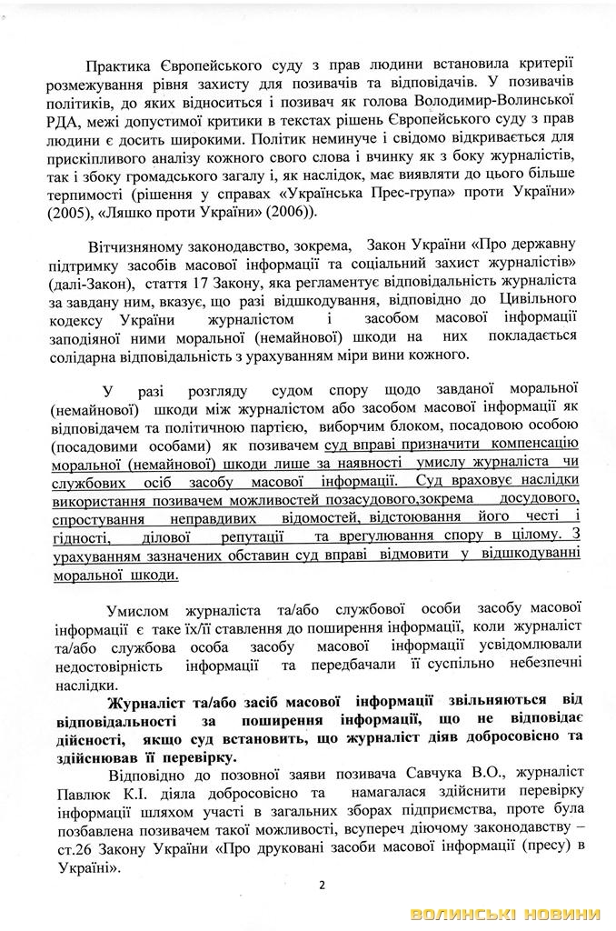Нагадаємо, як уже повідомляло Інформаційне агентство Волинські Новини, голова Володимир-Волинської РДА Володимир Савчук подав позов на газету «Місто вечірнє», бо вважає, що та своїми публікаціями зашкодила честі, гідності та діловій репутації чиновника.