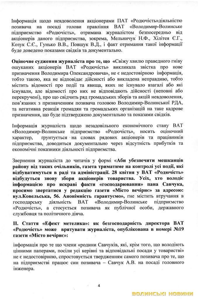 Також Володимир Савчук просить спростувати свідчення колишнього бухгалтера ВАТ «Родючість», використані в публікаціях. Суд, каже Едуард Залуський, може витребувати документи з підприємства, аби спростувати чи підтвердити цю інформацію.