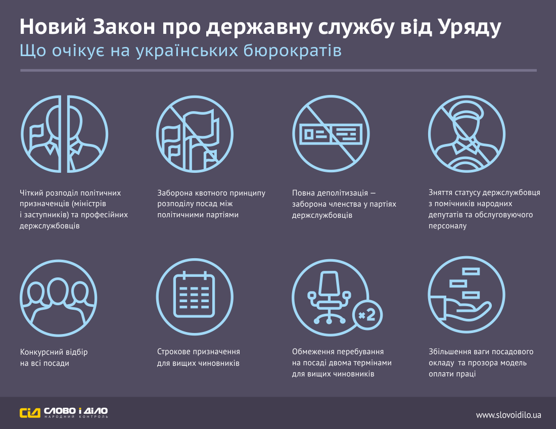 Як повідомляло Інформаційне агентство Волинські Новини, нова редакція закону про державну службу набула чинності в неділю, 1 травня. Закон був прийнятий Верховною Радою 10 грудня 2015 року, 31 грудня підписаний Президентом Петром Порошенком, а відповідно до перехідних положень закону з 1 травня він набуває чинності. Детальніше про те, що чекає держслужбовців, – в інфографіці від «Слова і Діла».