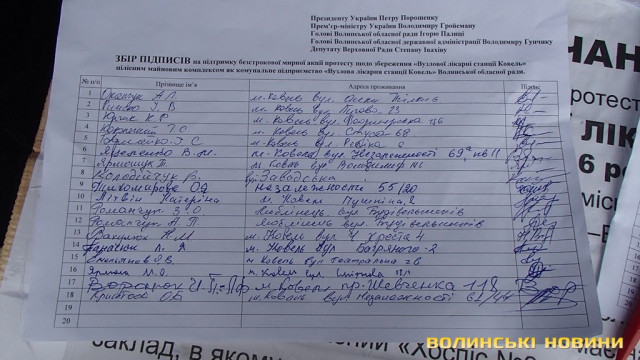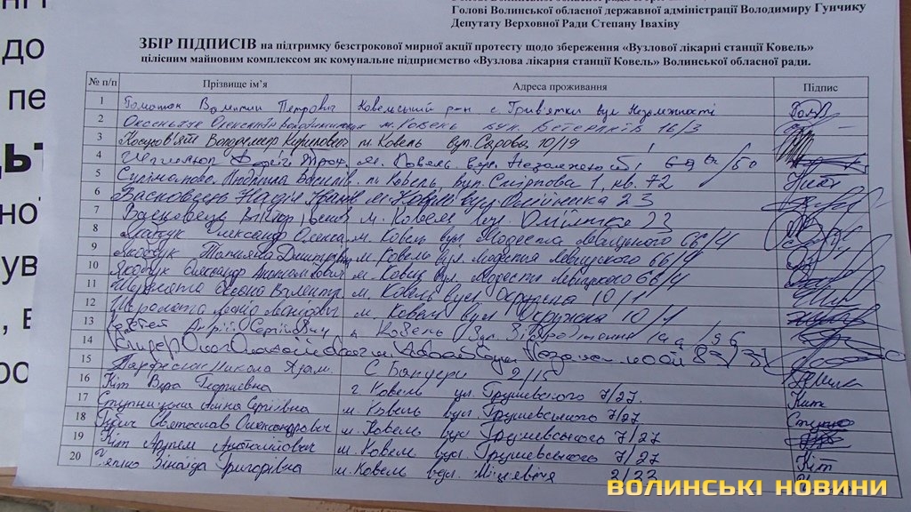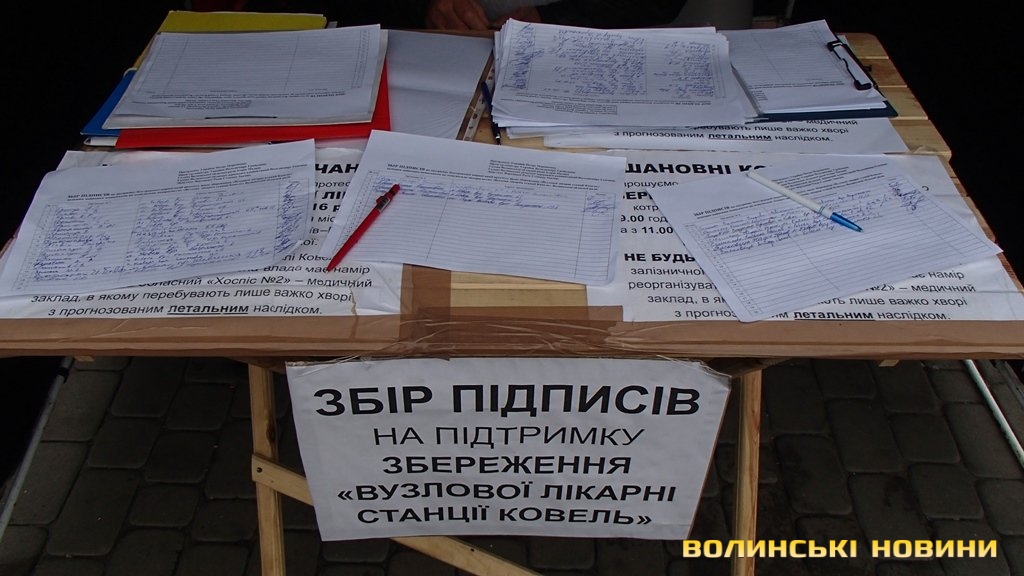 Упродовж двох днів ковельчани зібрали 10 тисяч підписів щодо збереження «Вузлової лікарні станції Ковель» цілісним майновим комплексом, як комунальне підприємство «Вузлова лікарня станції Ковель» Волинської обласної ради.
